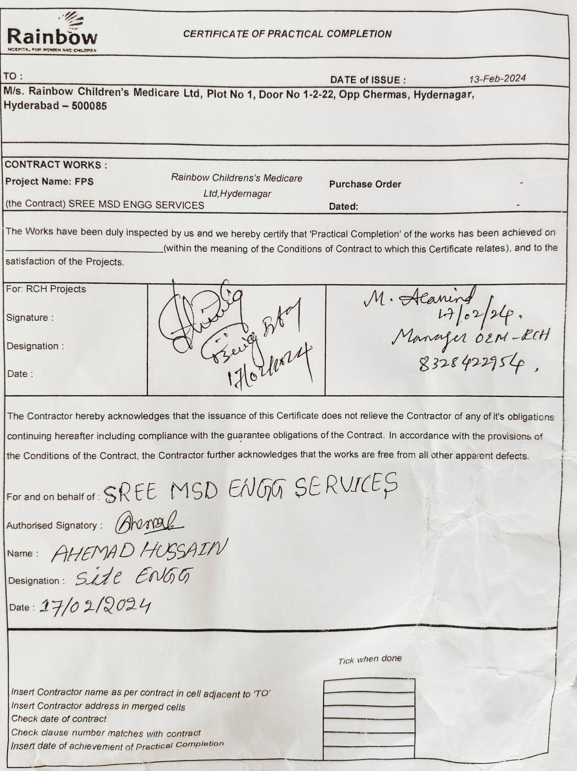 PRACTICAL COMPLETION CERTIFICATE FROM M/s RAINBOW HOSPITAL