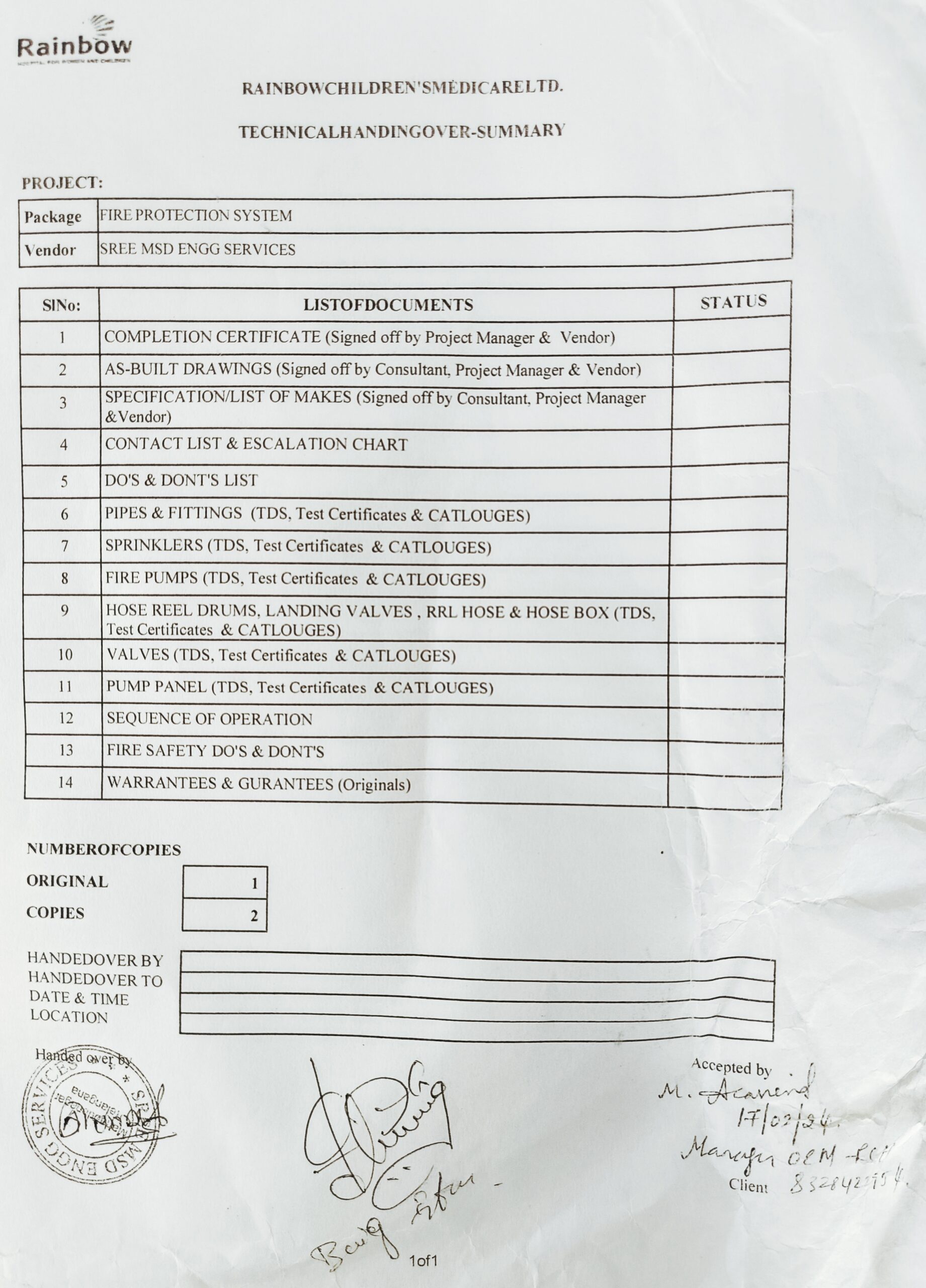 TECHNICAL HANDING OVER CERTIFICATE FROM M/s RAINBOW HOSPITAL
