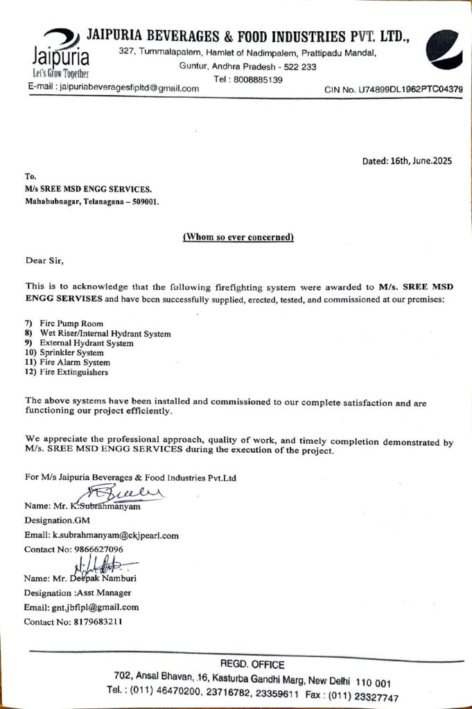 PEPSI FACTORY COMPLETION CERTIFICATE AT GUNTUR, ADHRA PRADESH